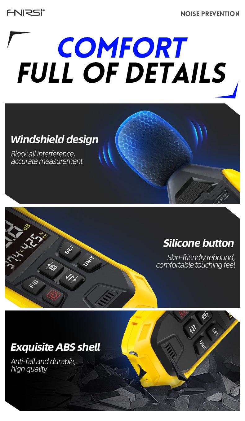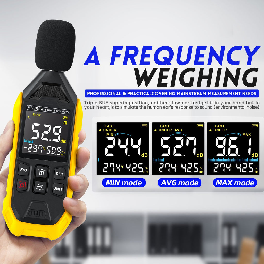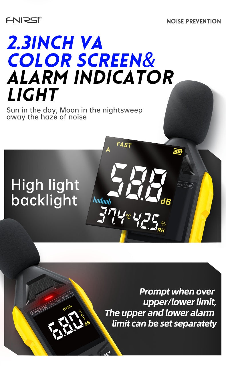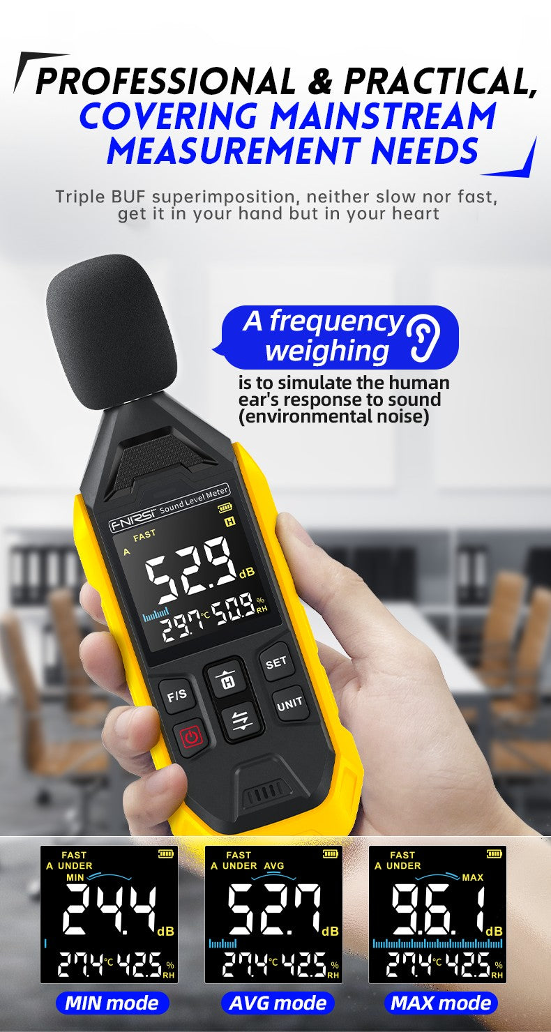 FNIRSI FDM01 digital støytester er en enhet som brukes til støydeteksjon og testing på offentlige steder som boliger, produksjon, byggeplasser og torg. Støy er en av de mest innflytelsesrike miljøgifter. Høyere desibellyder kan til og med forårsake alvorlig skade på menneskets trommehinner, noe som resulterer i døvhet, søvnløshet, svimmelhet og hodepine. Bruken av FDM01 digital støytester kan gi desibelene som støyen når slik at relevante tiltak kan iverksettes for å kontrollere og redusere støyen. Måleenheten for lyd er desibel. FDM01 digital støytester har en svært følsom sensor, høy presisjon, bredt bruksområde og kan brukes mye i støymåling i ulike miljøer.