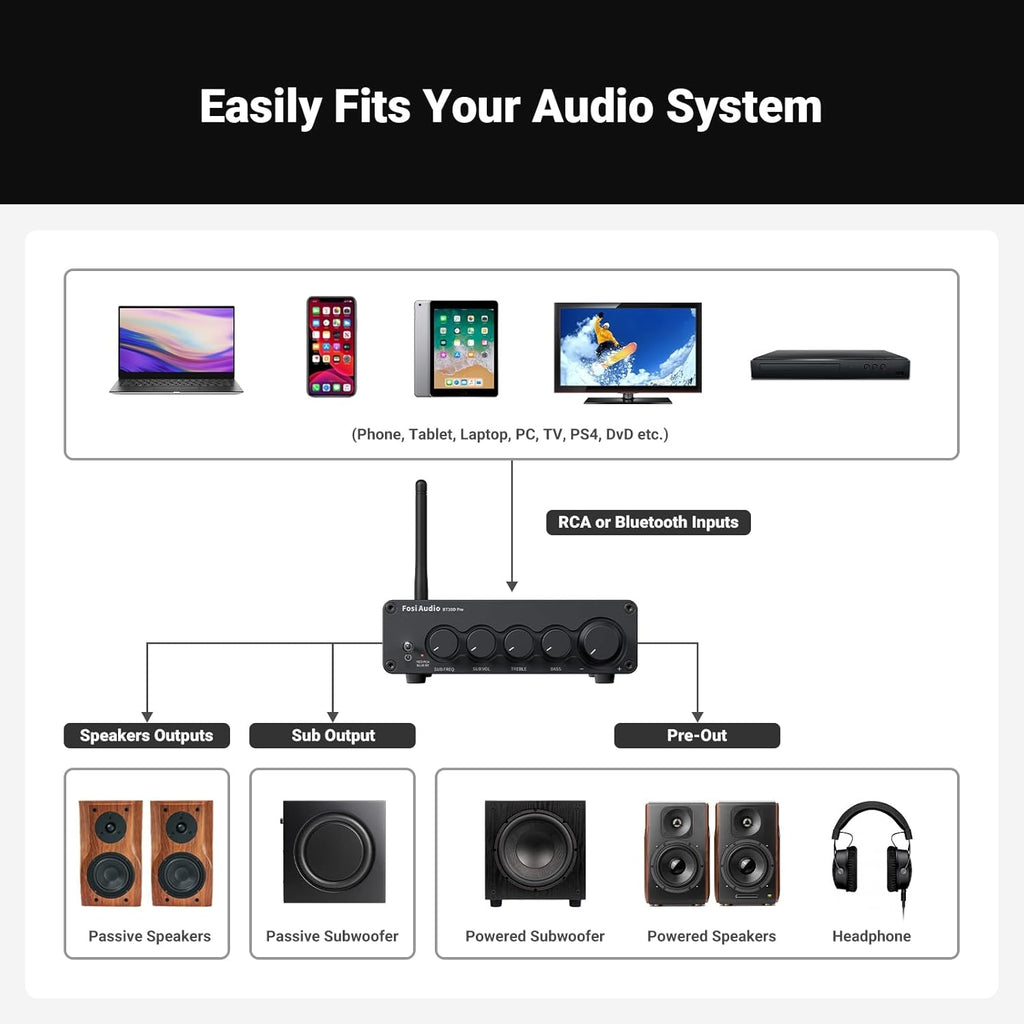 Fosi Audio Hi-Fi Bluetooth 5.0 Stereo Audio Mottaker Forsterker 2.1 Kanal Klasse D Integrert Amp 2X165W