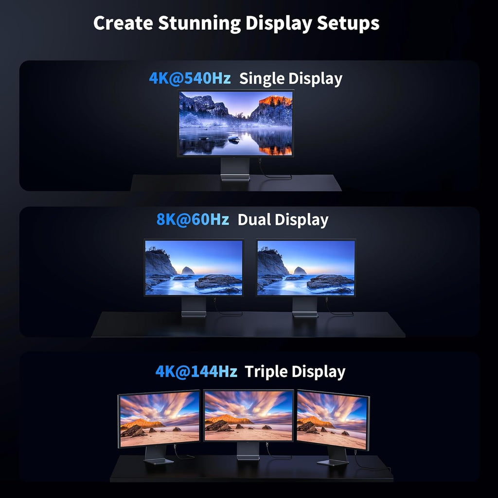 Støtte for flere skjermer: Håndterer doble 8K@60Hz eller trippel 4K@144Hz med 120Gbps båndbredde for eksepsjonell bildekvalitet og lav latens.