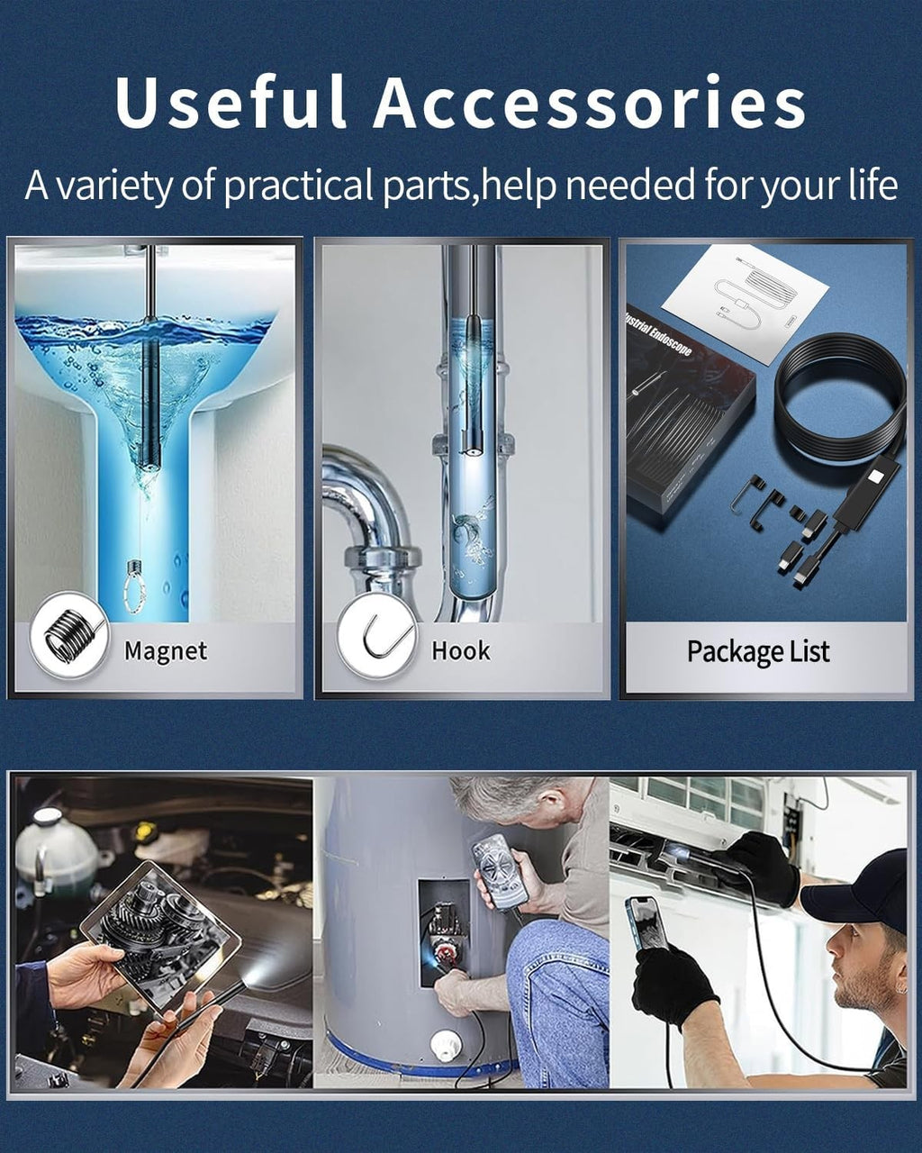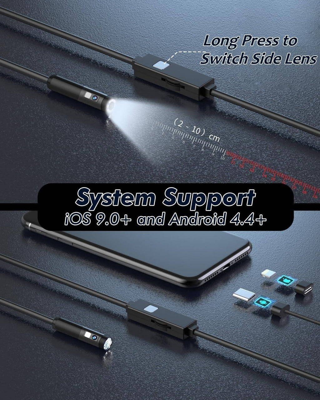 NÖRDIC Endoskopkamera med doble linser for mobiltelefon med lys, 1080P HD, 8 LED-lys, vanntett IP67, krever ikke WiFi, Android og iOS