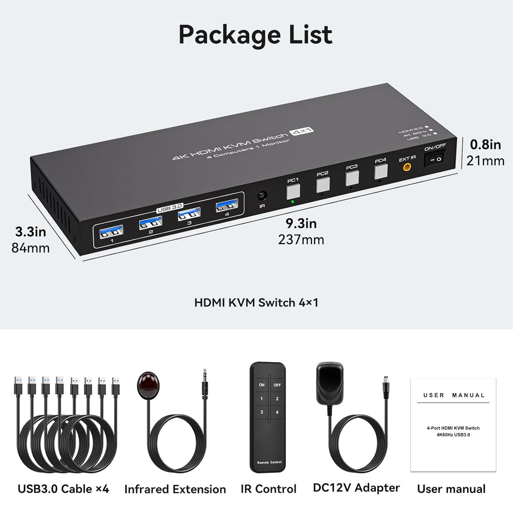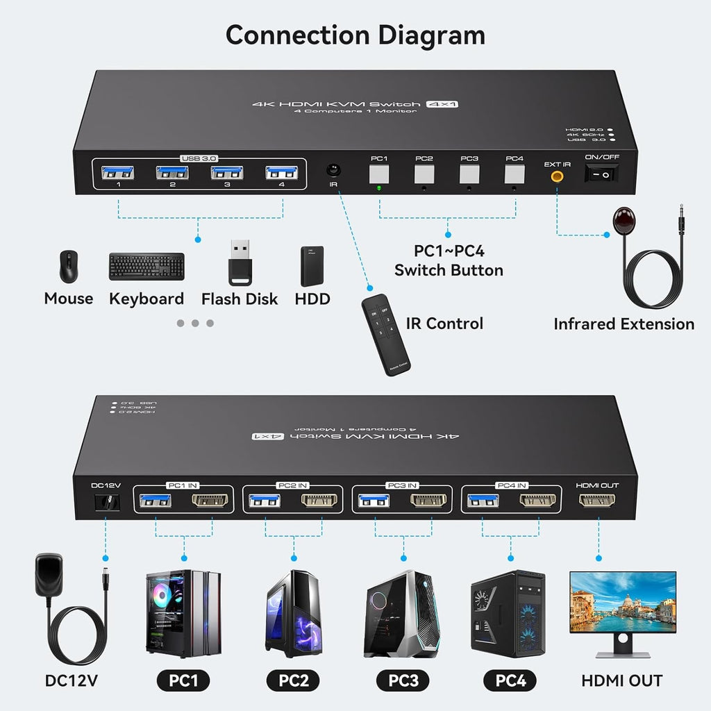 NÖRDIC HDMI KVM-bryter 4 datamaskiner 1 skjerm 4K 60Hz 1080p 120Hz 4xUSB-enheter