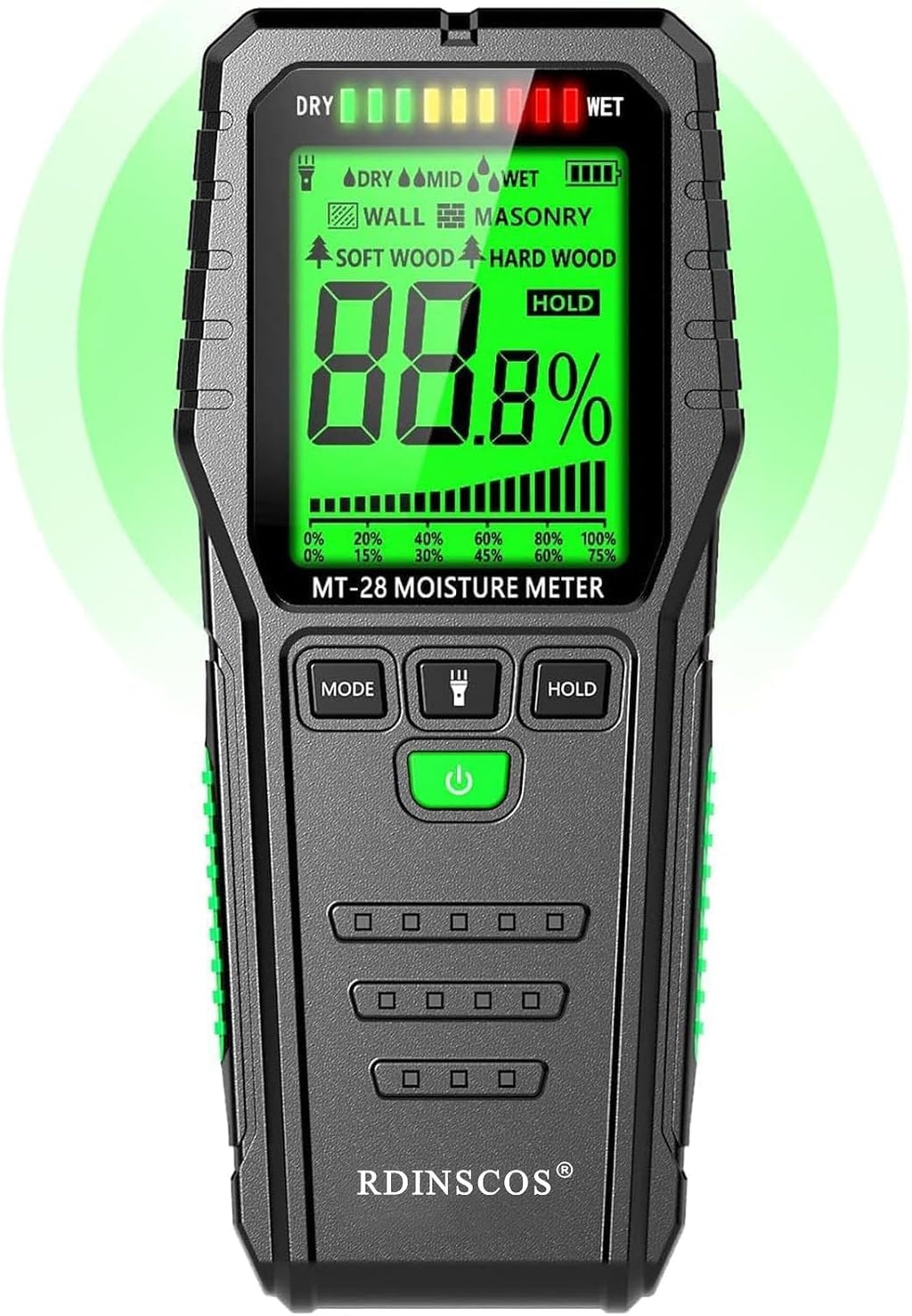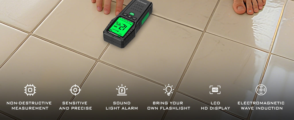 NÖRDIC Fuktmåler for lekkasjedeteksjon og vannskader er et avansert verktøy for raskt og skånsomt å måle fukt i tre, betong, gips og andre byggematerialer uten å skade overflaten. Med induktiv HF-elektromagnetisk måleteknologi, stor LCD-skjerm, datahold, lommelykt og automatisk avstenging gir den nøyaktige målinger med høy stabilitet – perfekt for hjem, kjeller, loft eller byggeinspeksjoner.