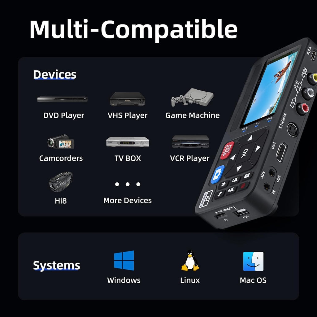 Video to Digital Converter recording box easily converts and stores analog video and audio signals to digital formats, recording at resolutions up to 1920x1080p@30. It supports AV or RCA (CVBS + R/L), S-video, and AUX inputs. Plug and play, no PC, software, or drivers required. VHS to Digital Converter supports a wide variety of analog sources, including VHS, DVD, VCR, Hi-Fi, camcorders, TV boxes, and game consoles. Whether you're looking for vintage home videos or live game recordings, it efficiently converts analog signals into digital files for storage. It's also compatible with hard drive formats like FAT32, exFAT, and NTFS. The video recording box features a 3.0-inch preview display and built-in speakers. While the device is recording, you can directly play back the recorded video and audio. Captured videos are converted into digital files and saved directly to a hard drive, USB flash drive, or TF/SD card, with no capacity restrictions. Video can be stored in MP4 format, and audio can be stored in MP3 format. Supports various TV standards such as NTSC 3.58, NTSC 4.43, PAL B/G/H/I/D/M/N, SECAM, etc. Audio sampling rates up to 48KHz, and supports uncompressed two-channel LPCM digital audio output.