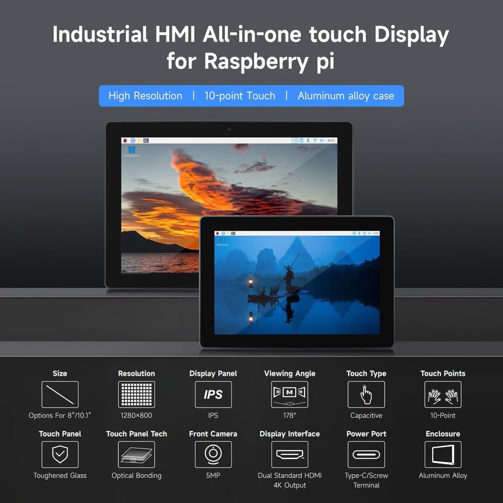 Waveshare Industrial HMI All-in-One 10.1 Inch Touch Display, Compatible with Raspberry Pi 4 (Included), Supports Dual 4K HDMI Output,